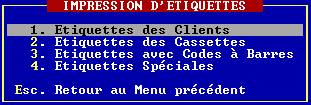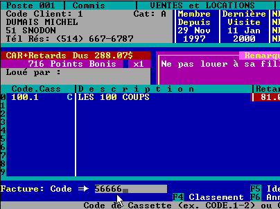 Vidéo Vision vous permet de faire imprimer toute une série d'étiquettes numérotées entre 50001 et 99999 à l'avance. Souvent ces étiquettes sont plastifiées pour une plus grande durabilité. On les colle ensuite sur les cassettes en indiquant le code de cassette correspondant en utilisant le module 2. Dossier des Films et 9. Gestion des Codes à Barres uniques par Cassette. Cette opération ne doit être faite qu'une seule fois. Par la suite l'ordinateur reconnaîtra ce code entier (entre 50001 et 99999) et le substituera à son propre code (comme par exemple A1234.12).Notez que ce code entier unique ne sera pas reconnu partout dans le système, mais seulement aux trois endroits suivants qui sont situés dans B. Ventes et Locations;