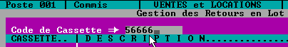 3. Dans le champs des Retours en lot. Accessible depuis Ventes et Locations, F7 et 4. Retours en lot.Cette option est aussi expliquée dans le logiciel. 2. Dossiers des Films, 9. Gestion des Codes à Barres uniques par Cassette. Appuyez ensuite sur la touche F4.