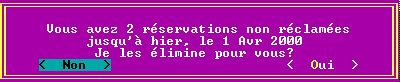 Si vous utilisez le système de Réservations et que vous avez des réservations non réclamée, l'ordinateur vous en avise et vous propose de les éliminer pour vous. Cette fenêtre est la même que celle montrée au début de l'exécution de Vidéo Vision. Si vous n'avez aucune réservations non réclamées, cette fenêtre ne sera pas montrée et Vidéo Vision passera directement au menu suivant.