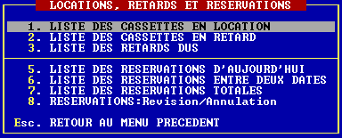 Permettent de visualiser globalement les cassettes actuellement en location ou seulement celles en retard. On peut aussi imprimer une copie sur papier.De très nombreux clubs Vidéo impriment la liste des retards dès leur arrivée le matin et téléphonent aux clients en retard pour les aviser. Des notes sont souvent inscrites sur la liste imprimée.